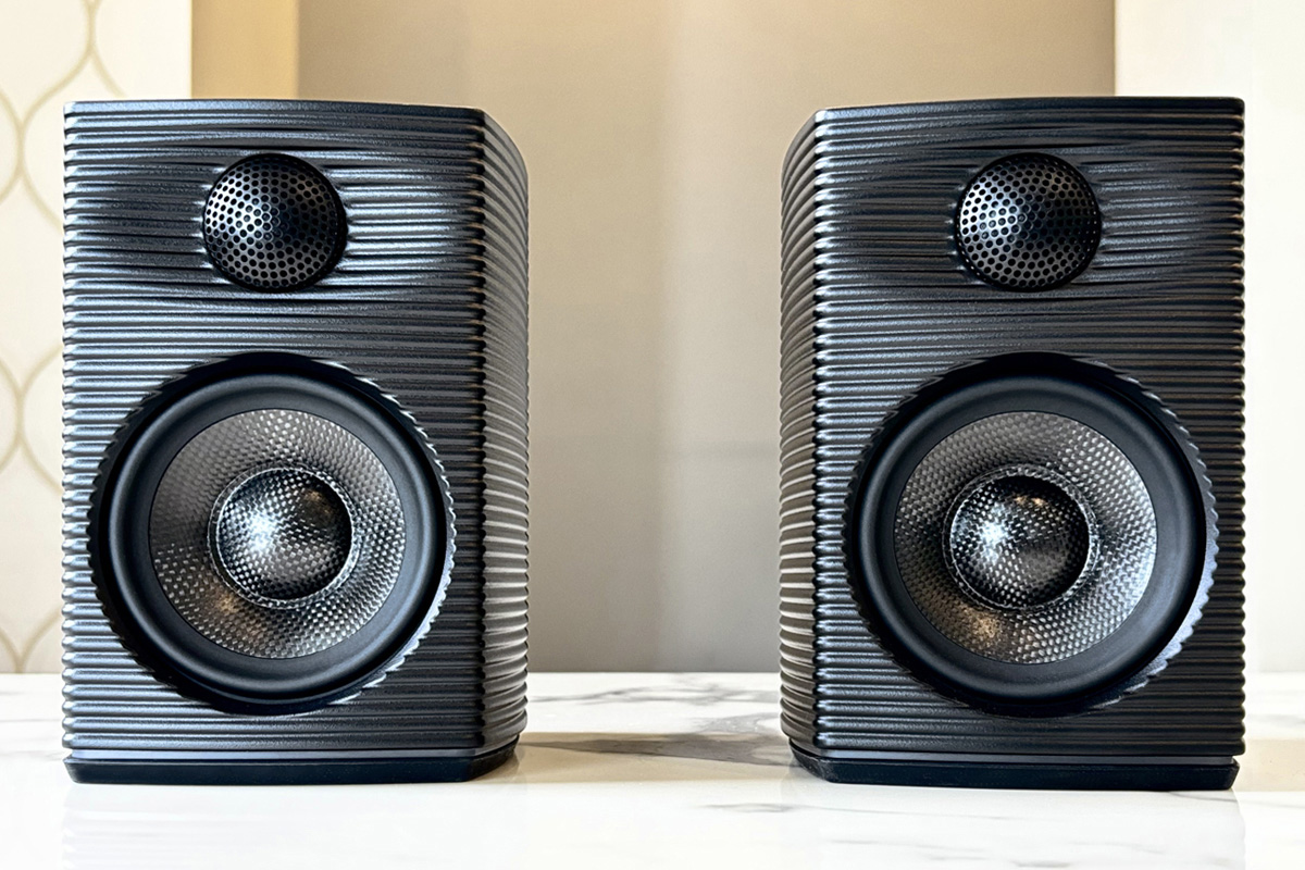 The speakers are available in either black or white finishes, with a purposeful industrial design; the cabinets feature clean lines with gently rounded edges and unusual horizontal ribbing over their entire surface. A protective mesh grille for the tweeter is incorporated into the baffle, though the midrange-woofer’s cone is left permanently exposed.